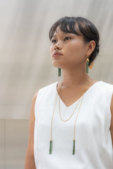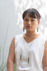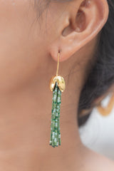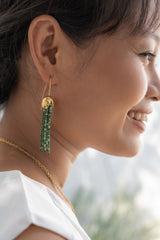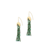 Strung with mixed green glass beads, this tassel earring takes its shape from a seed — a symbol of Eden's microgreens program and the way small beginnings can grow into something powerful. Finished with an 18K gold-plated stainless steel cap and 316L medical-grade threader. 2.75” by 0.75”.