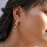 1.6" drop earring featuring faux coral, natural malachite, and brass beads, accented with a freshwater pearl suspended from the pendant. Crafted from 18K gold-plated stainless steel, this earring features a 316 medical-grade, 18K gold-plated stainless steel threader.